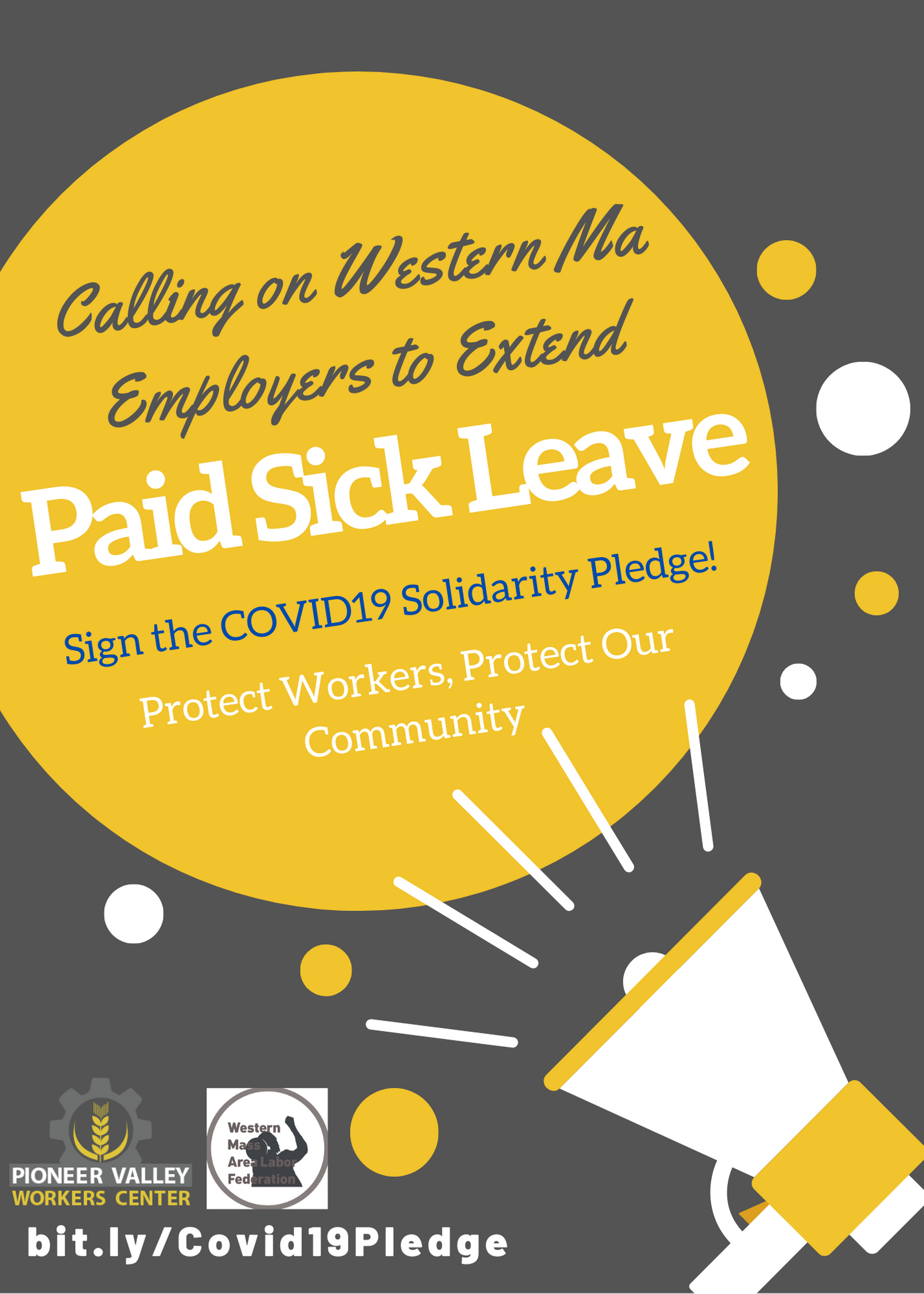 The Western Mass Area Labor Federation and Pioneer Valley Workers Center will be partnering on the COVID-19 Solidarity Pledge, which calls on ALL employers to extend paid sick leave to all workers.  Employers can sign on to the Convid-19 Solidarity Pledge at the following url: https://forms.gle/hiXc35Dtu9MX3Szq9. Please share widely with your networks.