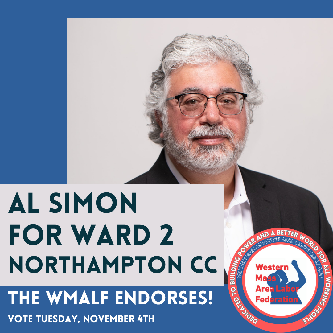 The Western Massachusetts Area Labor Federation is happy to announce its endorsement of Al Simon for Northampton City Council in Ward 2. Al Simon has been a tireless advocate for school funding and other unionized public services in Northampton.